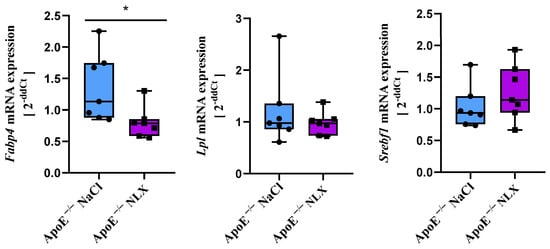 The NLX treatment in the ApoE−/− mice led to a statistically significant decrease in Fabp4 gene expression (NaCl 1.36 ± 0.54 vs. NLX 0.80 ± 0.25) as shown by significant treatment factor, F[(1, 12) = 6.10; p = 0.03]. However, no changes were observed in the expression of the Lpl (NaCl 1.09 ± 0.68 vs. 0.98 ± 0.22) (F[(1, 12) = 0.74; p = 0.41]) and Srebf1 (NaCl 1.02 ± 0.33 vs. 1.26 ± 0.43)) (F[(1, 12) = 1.30; p = 0.28]) genes (Figure 3).