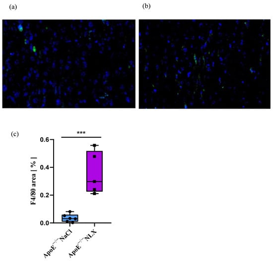 Representative photographs of immunofluorescence staining, with F4/80 antigen as a major macrophage marker, of liver cross-section in control (a) and treated (b) groups (microscopic photos performed at 20× magnification). Quantified stained area in control and treated groups (c) (NaCl n = 6, NLX n = 5) *** p < 0.001.