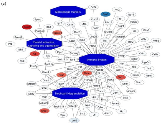 (a) Volcano plot for treated and non-treated mice with top six most up- and downregulated proteins shown; (b) proteomic data obtained from livers isolated from ApoE−/− mice after NLX administration compared to non-treated (z-score value; cut off; q value < 0.05, fold change ≥ 2.0 or ≤−2) (n = 7 per group); (c) enriched functional network in NTX-treated mice compared to control, as generated by PINE. Inhibited pathways are shown as blue central nodes along with red (upregulated) or blue (downregulated) protein nodes.