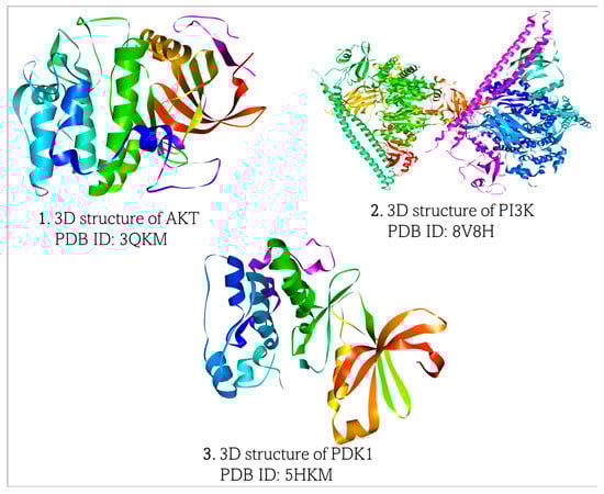Three-dimensional (3D) structures of Akt, PIP3K, and PDK1 were obtained from the Research Collaboratory for Structural Bioinformatics Protein Data Bank (https://www.rcsb.org, accessed on 7 March 2025), (Figure 2). The structures of all the proteins were generated by X-ray diffraction technique with Akt (PDB ID:3QKM), PIP3K (PDB ID:8V8H), and PDK1 (PDB ID:5HKM). The proteins were downloaded in PDB format and visualized and prepared for molecular docking in BIOVIA Discovery Studio Visualizer (https://discover.3ds.com/discovery-studio-visualizer-download, accessed on 7 March 2025).
