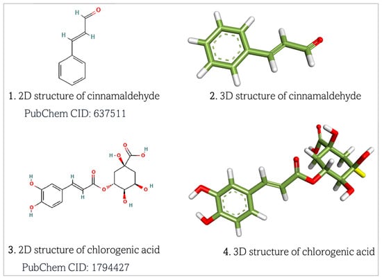 Chlorogenic acid and cinnamaldehyde were retrieved as structural data format (.sdf) files from the PubChem database (https://pubchem.ncbi.nlm.nih.gov/, accessed on 7 March 2025) (Figure 3). The retrieved 2D structures of the ligands were subsequently converted to 3D files using BIOVIA Discovery Studio Visualizer and saved as .pdb files [26,27].