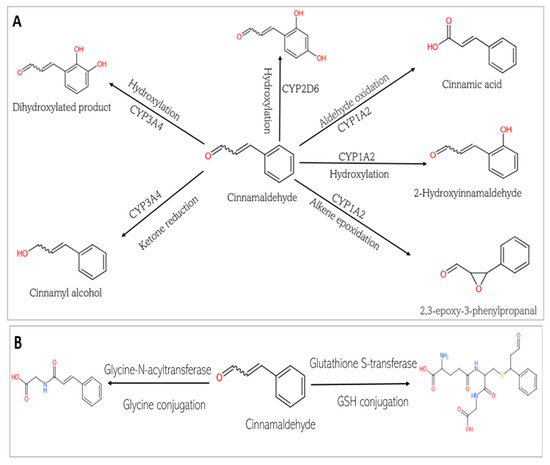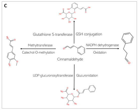 Phase I and Phase II metabolism of cinnamaldehyde by conjugation enzymes. (A) Phase I metabolism of cinnamaldehyde by cytochrome P 450. (B) Phase II metabolism of cinnamaldehyde by conjugation enzymes. (C) Phase II metabolism of cinnamaldehyde by human gut microbiota enzymes.
