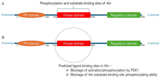 Predicted chlorogenic acid and cinnamaldehyde binding interactions with Akt. (A) The domain structure of Akt indicating the phosphorylation and substrate binding site in the protein kinase domain. (B) Representation of predicted ligand binding site in the kinase domain of Akt structure.