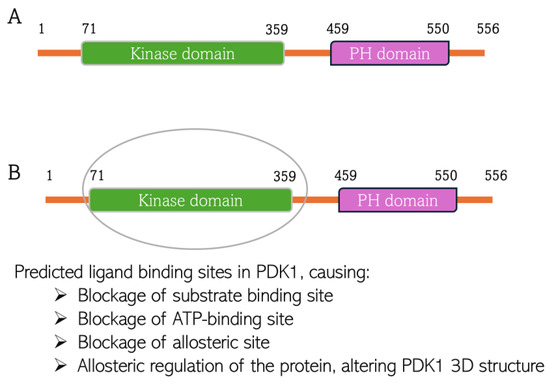 Predicted chlorogenic acid and cinnamaldehyde binding interactions with PDK1. (A) The domain structure of PDK1 indicating both kinase domain and pleckstrin homology (PH) domain. (B) Indication of predicted ligand binding site in the kinase domain of PDK1 structure.