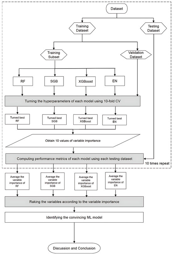 Figure 2 presents a flowchart of the proposed prediction framework and the key variable identification process that integrates all four machine learning methods. Initially, patient data were collected and preprocessed to construct the dataset. This dataset was then randomly split into 80% for training and 20% for testing. During model training, each machine learning algorithm underwent hyperparameter optimization through 10-fold cross-validation. A grid search was conducted across the parameter space to identify the best-performing configuration, with model selection based on the lowest root mean square error (RMSE) on the validation set. This established the most effective models for RF, SGB, XGBoost, and EN, and each model’s corresponding feature importance rankings were extracted.