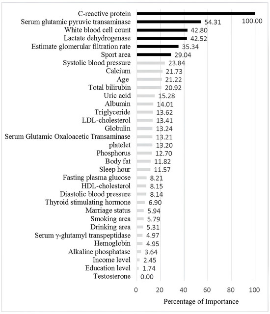 Table 6 ranks the variables for each factor in terms of importance as determined by the RF, SGB, XGBoost, and EN models. As shown, the relative importance of variables varied across the different machine learning methods. The rightmost column of the table presents the average importance scores for each variable, providing a consolidated view. Figure 3 offers a graphical representation of these results, with variables arranged from top to bottom in order of descending importance. As shown in Figure 3, C-reactive protein (CRP) ranked among the top contributors, followed by GPT, WBC, LDH, eGFR, and sport area in healthy elderly Taiwanese men.