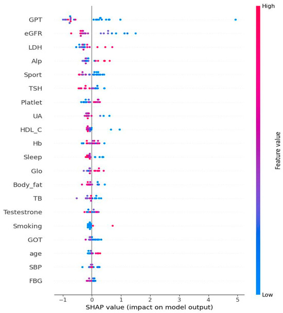 Bee swarm from Shapley additive explanation of stochastic gradient boosting. Note: The features at the top of the figure are the most important ones. The use of red in the diagram indicates a high impact on the homocysteine level. SGPT/ALT: serum glutamic pyruvic transaminase; eGFR: estimated glomerular filtration rate; LDH: lactate dehydrogenase; ALP: alkaline phosphatase; TSH: thyroid-stimulating hormone; UA: uric acid; HDL-C: high-density lipoprotein cholesterol; Hb: hemoglobin; Glo: globulin; TBIL: total bilirubin; plasma glucose; TBIL: total bilirubin; SGOT/AST: serum glutamic oxaloacetic transaminase; SBP: systolic blood pressure; FPG: fasting plasma glucose.
