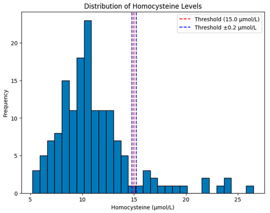 Finally, in Figure 6, the histogram shows the distribution of homocysteine levels in our dataset, with emphasis on a clinical threshold value of 15.0 µmol/L and a margin of ±0.2 µmol/L. The red dashed line is the threshold at 15.0 µmol/L, a cutoff commonly used to define hyperhomocysteinemia. The blue dashed lines have margins at 14.8 µmol/L and 15.2 µmol/L, showing a small range around the threshold (±0.2 µmol/L) that could be used for sensitivity analysis or as a classification boundary.