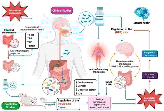 Considering these findings, it is suggested that probiotics can be used as adjuvant therapy for emotional or mood disorders, relieving depressive symptoms in participants with and without a clinical diagnosis. In this regard, possible mechanisms involved in the anxiolytic and antidepressant effects of probiotics include neurotransmitter modulation, as probiotics can influence the production and regulation of neurotransmitters such as 5-HT, GABA, NE, and DA, which are crucial for mood and emotional regulation. Reducing inflammation, probiotics have anti-inflammatory properties that can help mitigate systemic inflammation, a factor that has been linked to depression and anxiety. Another mechanism involved is interaction with the HPA axis. Several studies have reported that probiotics can affect HPA, which plays an important role in stress response and emotional regulation. Finally, maintaining the microbial diversity generated by probiotic treatment in the long term may be beneficial for the maintaining of mental health [122].