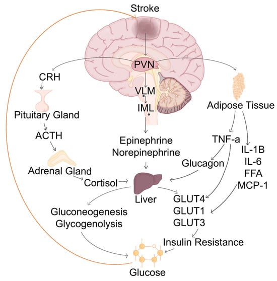 SH in acute stroke results from complex interactions between neurohormonal, metabolic, and inflammatory mechanisms, which disturb glucose homeostasis [28]. The regulation of glucose metabolism is primarily controlled by the glucose regulatory centers in the brain, including the hypothalamus, brainstem, and cerebral cortex. These centers integrate signals from peripheral glucose levels, neurohormonal inputs, and energy demands, ensuring appropriate glucose availability. The glucose regulatory center, primarily located in the hypothalamus, plays a crucial role in maintaining glucose homeostasis. The ventromedial hypothalamus (VMH) acts as a key metabolic sensor by detecting glucose fluctuations and modulating insulin sensitivity and hepatic glucose output [29]. In stroke, stress signals activate the VMH, leading to excessive glucose production via stimulation of the HPA axis and sympathetic nervous system [30]. The nucleus tractus solitarius (NTS) in the brainstem also contributes by integrating autonomic inputs and amplifying sympathetic output, further enhancing hepatic gluconeogenesis. Additionally, the prefrontal cortex and amygdala influence stress responses, modifying glucose metabolism through their interactions with the hypothalamus. The imbalance in these glucose-regulatory networks results in increased circulating glucose levels, contributing to metabolic dysregulation in stroke patients [29]. The HPA axis and the sympathetic adrenomedullary system are key regulators of stress responses, contributing to hyperglycemia through the release of counter-regulatory hormones such as cortisol, epinephrine, norepinephrine, glucagon, and growth hormone, culminating in hepatic glycogenolysis and gluconeogenesis [31]. Additionally, humoral factors, including pro-inflammatory cytokines, such as tumor necrosis factor-alpha (TNF-α), interleukin-6 (IL-6), and interleukin-1 beta (IL-1β), further exacerbate hyperglycemia by impairing insulin signaling and increasing hepatic glucose output. These mechanisms, while initially adaptive in providing energy to vital organs, become detrimental in stroke, where excessive glucose availability promotes oxidative stress, excitotoxicity, and poor neurological outcomes [31,32] (Figure 2).