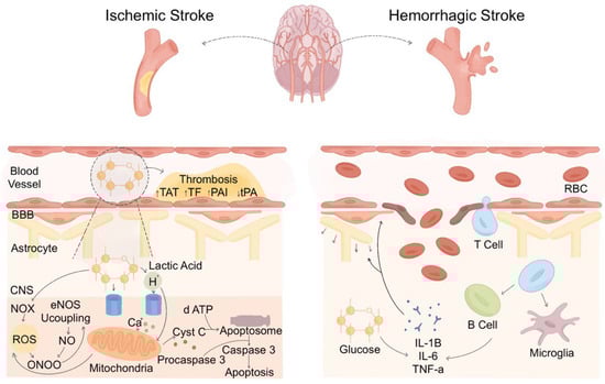 The inflammatory response differs significantly between ischemic and hemorrhagic stroke, both in its pattern and the consequences of inflammatory infiltration. In ischemic stroke, the inflammatory response begins within minutes of vascular occlusion, with microglia being the first activated as early as 30 min. Microglia initially express both pro-inflammatory cytokines such as TNF-α and IL-1β, as well as anti-inflammatory mediators such as interleukin-1 receptor antagonist (IL-1Ra) [38]. Neutrophils follow, contributing to BBB disruption, hemorrhagic transformation, and microvascular blockage through the release of reactive oxygen species (ROS), matrix metalloproteinases (MMPs), and proteolytic enzymes [38,39]. Monocytes differentiate into macrophages that may differentiate into either a pro-inflammatory M1 or anti-inflammatory M2 phenotype. T cells also participate, with pro-inflammatory subsets exacerbating injury, while regulatory T cells (Tregs) exert protective effects through interleukin-10 (IL-10) and transforming growth factor beta (TGF-β) [39].