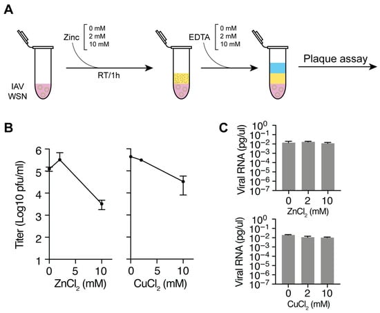 IAV is inactivated by zinc and copper ions. (A) Schematic of the experimental approach for inactivating IAV with zinc or copper ions and neutralization of the zinc or copper ions with EDTA. (B) IAV titers after exposure to zinc or copper chloride and neutralization with EDTA as measured on MDCK cells. (C) NA segment RT-qPCR analysis after exposure of IAV to zinc or copper chloride and neutralization with EDTA. Data points represent mean ± SD (n = 3).