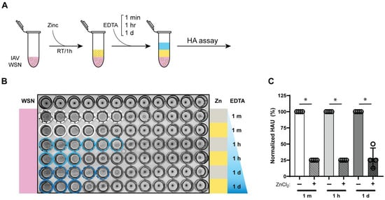 To assess the durability of zinc-mediated hemagglutination inhibition, we examined how long the antiviral effect persisted. After treating IAV with 10 mM ZnCl2 for 1 h and subsequent zinc chelation, the samples were further incubated at room temperature for 1 min, 1 h, or 24 h before their hemagglutination levels were assessed (Figure 4A). Control IAV samples were initially incubated for 1 h without zinc ions and then for a further 1 min, 1 h or 24 h at identical room temperature incubation conditions. As shown in Figure 4B,C, the hemagglutination inhibition achieved after 1 h of zinc exposure was maintained for the entire 24 h period, with comparable levels of inhibition observed. Since free zinc ions were chelated with EDTA immediately after the 1 h incubation, no further zinc-mediated inactivation could occur during the subsequent 24 h period. Overall, these findings indicate that zinc-mediated hemagglutination inhibition remains effective and stable for at least 24 h, suggesting that the antiviral properties of zinc ions persist over an extended period of time, even after zinc ions are removed.