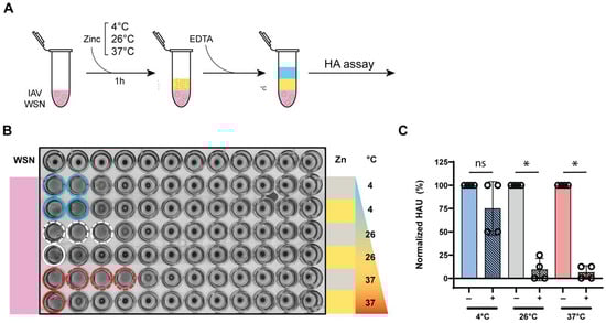 Zinc-mediated HA inactivation remains effective across various temperatures. (A) Experimental design for evaluating the zinc-mediated IAV hemagglutination inhibition at 4 °C, 26 °C, and 37 °C. (B) Assessment of sialic acid (SA) binding by measuring hemagglutination of 1% turkey RBCs with IAV samples incubated at different temperatures in presence (yellow) or absence (gray) of zinc ions for 1 h followed by zinc neutralization with EDTA. Colored solid and dashed circles indicate hemagglutination. (C) Hemagglutination units (HAU) of IAV samples treated with zinc ions, normalized to the untreated IAV samples that were incubated at the same temperature as the zinc ion treated condition. A Mann–Whitney U test was used to compare the recovery percentages between conditions, * p ≤ 0.05, ns, non significant.