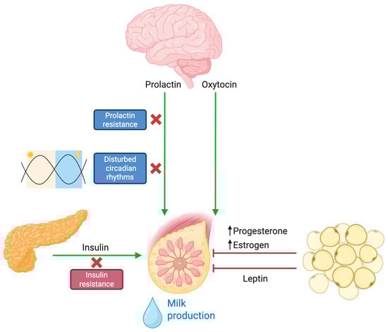 Prolactin is the key hormone that drives lactogenesis. In a normally functioning lactogenic system, the act of infant suckling elicits a rapid and robust release of prolactin, which in turn stimulates milk synthesis. However, multiple studies have indicated that mothers with obesity exhibit a provoked lower prolactin response to suckling in the early postpartum period [34]. Both clinical observations and animal models have provided evidence that obesity induces central and peripheral prolactin resistance. In obese murine models, high basal levels of phosphorylated STAT5 (a downstream mediator of prolactin receptor signaling) are noted, yet the acute stimulatory response to prolactin is markedly attenuated [33]. This hormonal insensitivity compromises the induction of lactogenesis II, resulting in a delay in the onset of copious milk production (Figure 2).