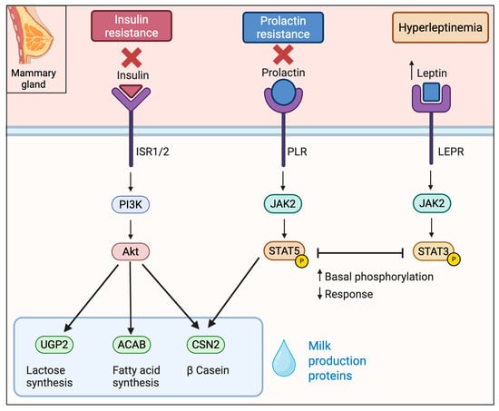 Obesity-induced insulin resistance blunts anabolic signaling of the mammary gland. Under normal lactation, insulin acting via Insulin Receptor (INSR)—Insulin Receptor Substrate IRS1/2- Phosphoinositide 3-Kinase (PI3K)—Protein Kinase B (AKT) drives alveolar differentiation and milk synthesis, while prolactin signals via Prolactin Receptor (PRLR)- Janus Kinase 2 (JAK2)—(STAT5) to induce milk-protein genes (e.g., CSN2 for β-casein) [48,49]. In obese, insulin-resistant women, mammary insulin signaling is suppressed, e.g., IRS2 mRNA was ~2.3-fold lower in lactating obese vs. lean women [50]. Correspondingly, downstream anabolic genes are downregulated as follows: lactogenic genes ACACB (fatty acid synthesis), UGP2 (lactose synthesis), and β-casein (CSN2) are 3.1, 2.7, and 2.1 fold decreased. Notably, genes in the PRLR/JAK2/STAT5 pathway were unchanged, suggesting the defect is functional. Indeed, animal studies show obese dams have high basal mammary pSTAT5 but fail to respond to prolactin (true prolactin resistance) [33]. Thus, obesity creates an “insulin-resistant” gene signature in mammary without gross loss of PRL receptor, implicating downstream or cross-talk inhibition of STAT5 (Figure 3).