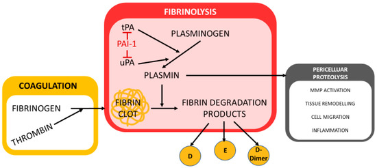 Plasminogen is converted into the fibrinolytic enzyme plasmin by the plasminogen activators urokinase (u-PA) and tissue plasminogen activator (t-PA). As a proteolytic enzyme, plasmin has a high affinity for fibrin and is responsible for fibrin cleavage during fibrinolysis. Plasminogen activator inhibitors (PAI) are plasma proteins that act as inhibitors of fibrinolysis. Plasminogen activator inhibitor type 1 (PAI-1) (Figure 2) is the most effective PAI and inhibits both plasminogen activators u-PA and t-PA.