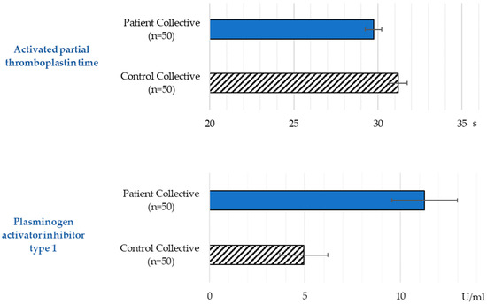 Activated partial thromboplastin time and plasminogen activator inhibitor type 1 values in the patient and the control collective (mean and standard error).