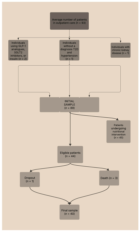Individuals were excluded from the study if they had difficulty completing study instruments, demonstrated impediments to regular data collection, or lacked a confirmed diagnosis of both T2D and hypertension. Exclusion also applied to those undergoing insulin therapy, using sodium–glucose cotransporter-2 (SGLT-2) inhibitors, or glucagon-like peptide-1 (GLP-1) analogs, as these medications can significantly alter metabolic outcomes and potentially confound intervention effects [32].