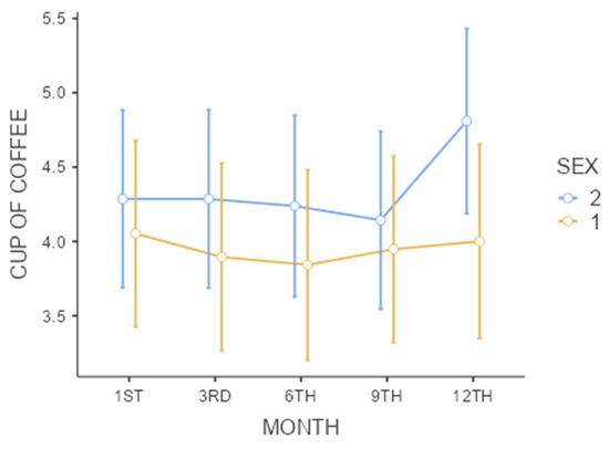 Coffee intake (cups) over 12 months. Normal data are expressed as the mean ± the standard deviation (SD). Confidence intervals that do not intersect represent significant differences (a repeated measures ANOVA followed by Tukey’s post hoc test for parametric data); Sex: 1—men and 2—women; no significant differences were found in the time period studied within each sex or between sexes. * p < 0.05. Note: One cup = 50 mL.
