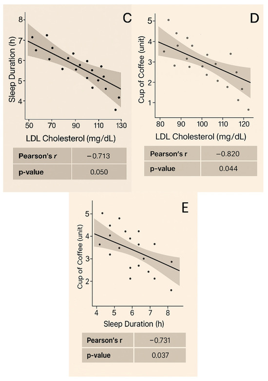 Correlations observed at baseline and at the 12th month in women: (A) Sleep duration shows a strong inverse correlation with FBG at baseline (r = −0.841, p = 0.031). (B) Sleep duration shows a strong inverse correlation with HbA1c at baseline (r = −0.831, p = 0.037). (C) Sleep duration shows an inverse correlation with LDL cholesterol at baseline (r = −0.713, p = 0.050). (D) Coffee consumption shows a strong inverse correlation with LDL-C at baseline (r = −0.820, p = 0.044). (E) Sleep duration shows a strong inverse correlation with coffee consumption at the 12-month mark (r = −0.731, p = 0.037).