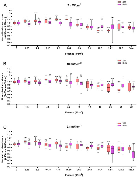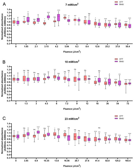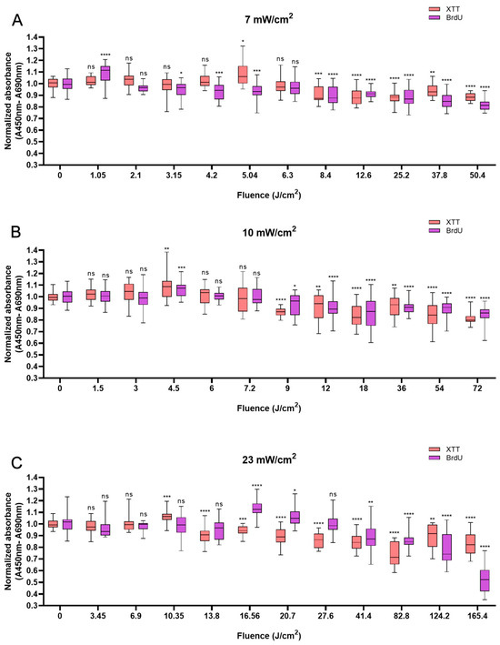 Overview of the response of NHDFs to BL with 0–120 min of irradiation by XTT and BrdU assays at 7, 10, and 23 mW/cm2. The absorbance was normalized and compared to that of non-irradiated controls. (A): Changes in cell viability and cell proliferation under the light irradiance of 7 mW/cm2 24 h after BL irradiation, with fluence ranging from 0 to 50.4 J/cm2. (B): Normalized absorbance from XTT and BrdU 24 h after irradiation and grouped by fluence from 0 to 72 J/cm2, as shown on the x-axis. (C): Cell viability and proliferation responses of NHDFs after 23 mW/cm2 irradiation, with fluence ranging from 0 to 165.4 J/cm2. The data are shown as boxplots with medians, IQRs, and error bars for outliers (n = 3 repetitions, *: p < 0.05, **: p < 0.01, ***: p < 0.001, ****: p < 0.0001, ns: not significant; RM ANOVA: Dunnett’s test).