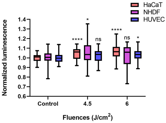 BL irradiation altered ATP quantification in HaCaTs, NHDFs, and HUVECs at different doses (control, 4.5, and 6 J/cm2). The data are shown as boxplots with medians, IQRs, and error bars for outliers (n = 3 repetitions, *: p < 0.05, ****: p < 0.0001, ns: not significant, RM ANOVA: Dunnett’s test). The luminescence was normalized to that of the controls without irradiation.