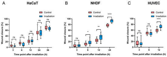 Migration was quantified at different time points after BL in three cell types ((A): HaCaTs, (B): NHDFs, and (C): HUVECs). The data are shown as boxplots with medians, IQRs, and error bars for outliers (n = 3 repetitions, *: p < 0.05, **: p < 0.01, ****: p < 0.0001, ns: not significant, paired Student’s t test).