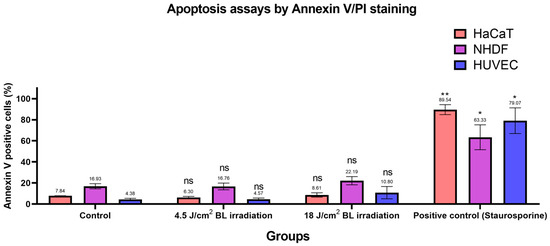 Based on the previous findings [30,31], we designed apoptosis assays with Annexin V/PI staining to evaluate apoptotic conditions after irradiation with 4.5 and 18 J/cm2 (30 min × 10 mW/cm2). Annexin V+/PI− and Annexin V+/PI+ cells were considered apoptotic. As shown in Figure 6, apoptosis in the irradiation groups (4.5 and 18 J/cm2 BL) was not significantly different from the levels in the corresponding control groups among HaCaTs, NHDFs, and HUVECs. After sorting, only cells exposed to 1 μM staurosporine for 24 h in the positive control group presented significantly increased apoptotic levels, as measured by flow cytometry. Exemplary results of Annexin V/PI staining on HaCaTs, NHDFs, and HUVECs grouped by control, 4.5, 18 J/cm2 BL irradiation, and positive control are shown in Figure S10. Accordingly, the proportions of cells in each quadrant were compared between treatment groups and controls in Figure S11.