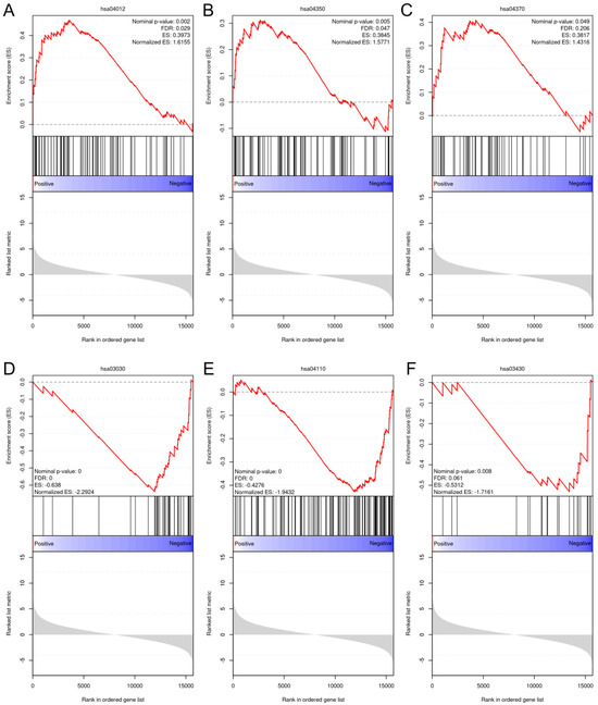 GSEA plots of the upregulated and downregulated gene sets enriched in different pathways from the KEGG database. (A): ErbB signaling pathway (hsa04012); (B): TGF-β signaling pathway (hsa04350); (C): VEGF signaling pathway (hsa04370); (D): DNA replication pathway (hsa03030); (E): cell cycle (hsa04110); and (F): mismatch repair pathway (hsa03430).