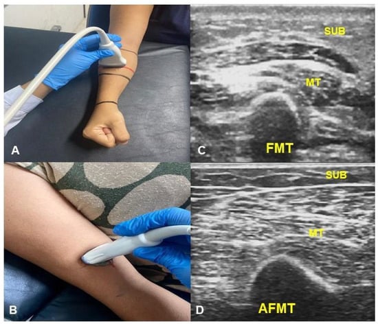 (A) Patient and transducer positioning for ultrasound imaging of forearm flexors (FMT); (B) Ultrasound image of FMT; (C) Patient and transducer positioning for ultrasound imaging of arm flexors (AFMT); (D) ultrasound image of AFMT. SUB: subcutaneous tissue; MT: muscle thickness. Source: The authors (2005).