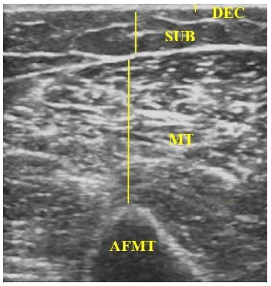 B-mode ultrasound images were acquired using a LOGIC V5 system (GE) with a linear L6-12 transducer. Standardised parameters were used for all measurements: 8 MHz frequency, 79% gain, and 8 cm depth. In each limb, two regions of interest (ROIs) were defined, one on the forearm and one on the arm, both 10 cm from the cubital fossa []. Images were captured with the transducer positioned perpendicular to the skin over the muscle belly of interest (Figure 1), applying minimal pressure and using a water-based conductive gel []. After freezing the image, the following were measured: (i) the dermal–epidermal complex (DEC)—the linear distance from the posterior echogenic border of the epidermal entry echo to the posterior echogenic border of the dermis []; (ii) subcutaneous tissue (SUB)—the distance between the DEC and the muscle fascia [,]; (iii) muscle thickness (MT) of the forearm flexors (FMT)—the distance between the radius and the muscle interface []; and muscle thickness of the arm flexors (AFMT)—the distance between the muscle interface and the humeral periosteum, including the biceps brachii and brachialis muscles (Figure 2) [,].