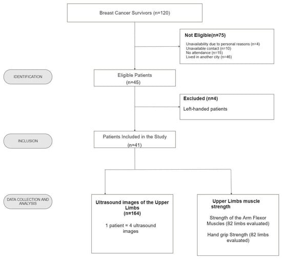 We recruited 120 female breast cancer survivors, of whom 41 were included in this study (Figure 3). In total, we obtained 164 ultrasound images of the upper limbs, representing four per patient (two from the ipsilateral limb and two from the contralateral limb). Muscle strength was assessed using manual and digital dynamometers, resulting in the analysis of 82 upper limbs (ipsilateral and contralateral), with measurements taken separately for each device.