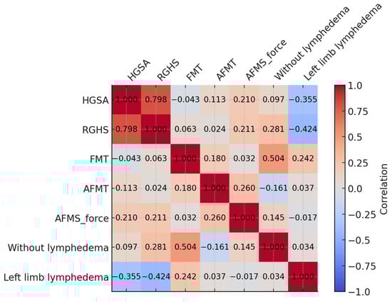 The heatmap in Figure 4 shows the correlations between the analysed variables. The AHGS and RHGS handgrip strengths were highly correlated (rs = 0.798, p < 0.001). The absence of lymphoedema was moderately associated with a higher FMT in the ipsilateral limb (rs = 0.504, p < 0.001). Furthermore, a weak negative correlation was found between the presence of lymphoedema in the left (non-dominant) limb and AHGS (rs = −0.335, p = 0.023), while a moderate negative correlation was observed with RHGS (rs = −0.424, p = 0.006).