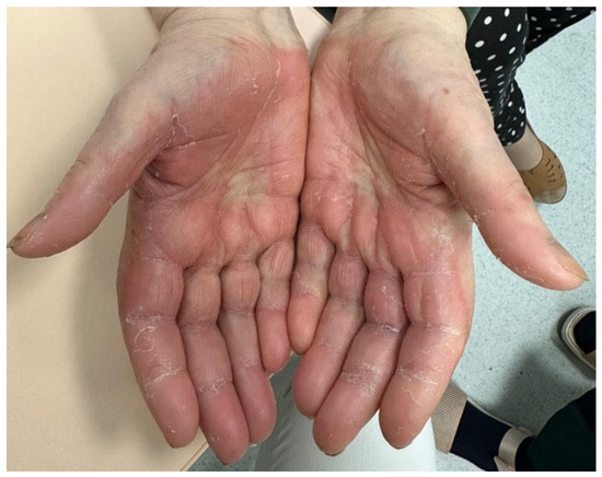 Palmar erythema with desquamation, consistent with hand-foot syndrome (palmoplantar erythrodysesthesia) in a patient undergoing capecitabine treatment (written informed consent was obtained from the patient for the publication of this clinical image).