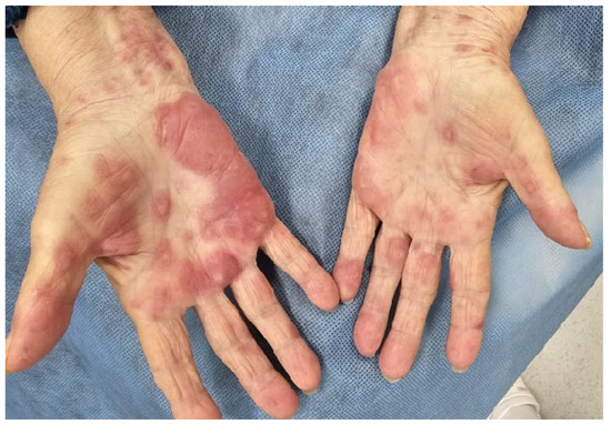 Erythema exudativum multiforme (EEM) is a rare but clinically significant inflammatory dermatosis that may be triggered by certain chemotherapeutic agents, particularly platinum-based compounds and antimetabolites. Clinically, EEM is characterized by classic targetoid lesions—symmetrical, round, erythematous macules or papules with a central dusky zone and a surrounding pale halo—most commonly affecting the extensor surfaces, palms, and soles. In patients with breast cancer, EEM has been reported as a cutaneous adverse reaction following adjuvant chemotherapy [46,47] (Figure 2). Although generally self-limited, the condition can cause considerable discomfort and cosmetic concern.