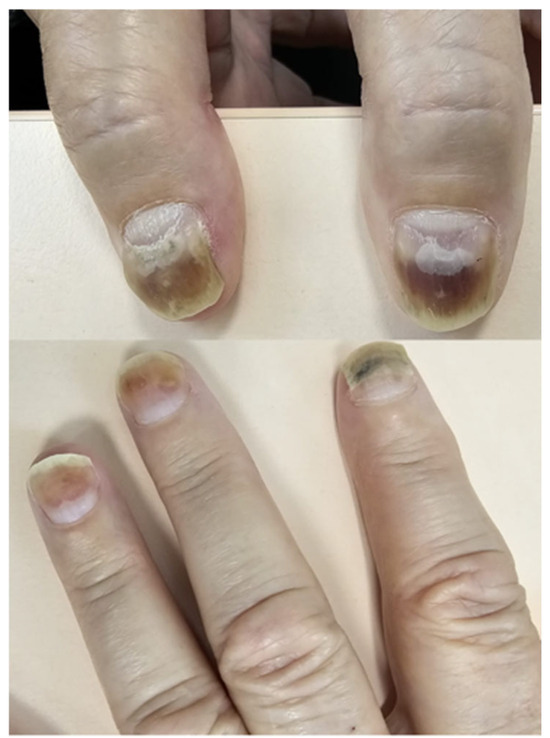 Nail changes encompass a broad spectrum of abnormalities [58] (Figure 3 and Figure 4). Common manifestations include onycholysis (separation of the nail plate from the nail bed), onychomadesis (complete nail shedding), Beau’s lines (transverse grooves), leukonychia (white discoloration), melanonychia (nail pigmentation), and paronychia (inflammation of the nail folds) [55,57]. These alterations may cause discomfort, pain, or functional impairment, especially when multiple digits are affected. EGFR inhibitors are particularly associated with paronychia, which occurs in up to 10–15% of patients, while the incidence is lower (<1%) with capecitabine [55,59,60]. Although rarely dangerous, the cosmetic and functional consequences can be significant. Most nail abnormalities are self-limiting and gradually resolve as the nail grows out after treatment cessation [52,55].