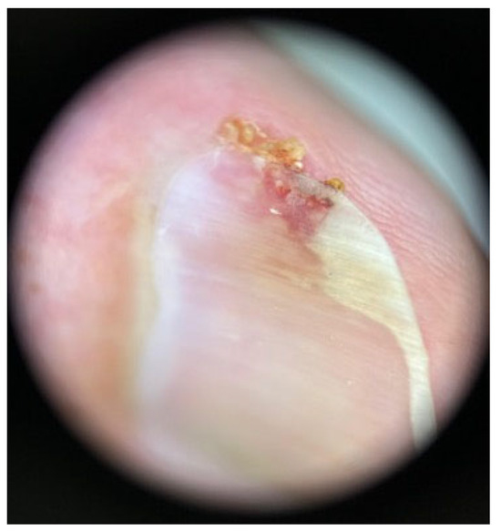 Periungual pyogenic granuloma localized at the proximal nail fold, presenting with friable vascular tissue, induced by taxane-based chemotherapy (written informed consent was obtained from the patient for the publication of this clinical image).