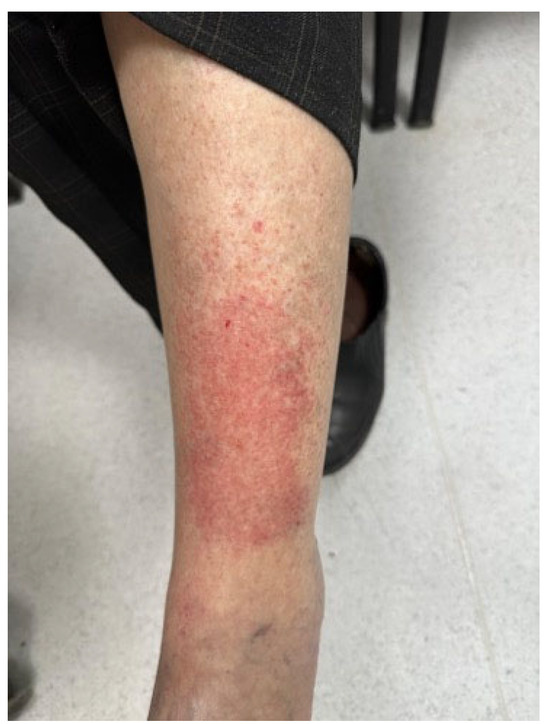 Erythematous and scaly skin lesions of the lower leg observed in a breast cancer patient receiving combination therapy with ribociclib (CDK4/6 inhibitor) and letrozole (aromatase inhibitor). The reaction was consistent with a drug-induced dermatitis (written informed consent was obtained from the patient for the publication of this clinical image).