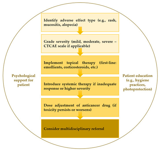 In summary, early recognition and accurate grading of chemotherapy-induced dermatologic toxicities are essential for guiding dose modifications, initiating timely supportive care, and ensuring treatment adherence. Failure to proactively manage these adverse events may compromise not only patient comfort, but also the overall oncologic outcomes.