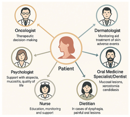 The rise of precision oncology and biologically targeted therapies has further diversified the spectrum of mucocutaneous toxicities. These adverse effects are often dose-dependent, mechanism-specific, and in some cases predictable—allowing for risk stratification and anticipatory management. Recent studies have also highlighted the potential of nanoparticle-based delivery systems and biologic-modifying agents to reduce drug toxicity while maintaining therapeutic efficacy [13,14]. Optimal management requires early recognition, accurate classification, and multidisciplinary collaboration among oncologists, dermatologists, oral medicine specialists, nurses, and other healthcare professionals. This integrative approach can help prevent unnecessary dose modifications, alleviate psychological burden, and support treatment adherence—ultimately improving oncologic outcomes [15].