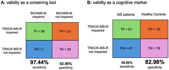 Validity of TRACK-MS-R. Standard 2 × 2 contingency tables illustrating the validity of TRACK-MS-R as a screening tool (A) and as a cognitive marker (B). The matrices display true positives (TP), false positives (FP), true negatives (TN), and false negatives (FN) to determine sensitivity and specificity. (A): classification of MS patients by TRACK-MS-R compared to the gold standard BICAMS-M. (B): classification performance of TRACK-MS-R in differentiating MS patients from Heathy Controls. Colors are used solely for visual clarity: green = TP, orange = FP, blue = FN, purple = TN.