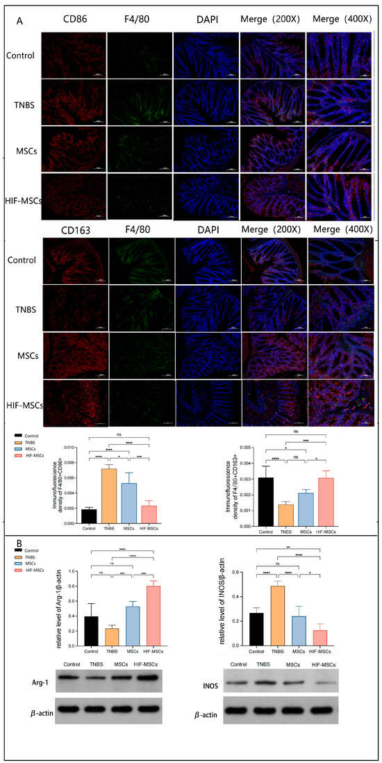 HIF-MSCs promoted M1 macrophage polarization toward M2 macrophages in vivo. (A). Immunofluorescence analysis was used to detect the expressions of F4/80+CD86+ and F4/80+CD163+ in colonic tissue, revealing that HIF-MSCs significantly decreased the relative expression ratio of F4/80+CD86+ and increased the relative expression ratio of F4/80+CD163+ compared with those promoted by PBS and MSCs (**** p < 0.0001, *** p < 0.001, * p < 0.05). (B). Western blotting analysis was used to detect the M2 characteristic Arg-1 and the M1 characteristic INOS. HIF-MSCs upregulated Arg-1 expression and downregulated INOS expression in colon tissue compared with PBS and MSCs (**** p < 0.0001, *** p < 0.01, ** p < 0.01, * p < 0.05). “ns” represents no significant difference.