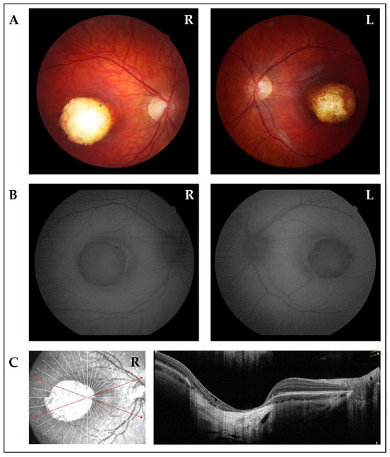 Ophthalmological imaging studies of the proband. (A) Fundus photographs of right eye (R) and left eye (L) show wide colobomatous-like chorio-retinal atrophic macular lesions and visible sclera. (B) Fundus autofluorescence of right (R) and left (L) eyes displays the absence of fluorescence in macular lesions, indicating the absence of retinal pigment epithelium (RPE). The edge of the lesions exhibited mild high-fluorescence halo. (C) OCT scan of the right eye (R) displays a wide area characterized by atrophy of neurosensory retina, RPE, and choroid, with underlying increase in backscattering signal. Focal subretinal hyperreflectivity is observed at the edge of the lesion.