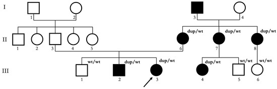 Pedigree of the Italian NCMD family described in this study. Squares indicate male subjects; circles indicate female subjects. Proband is indicated with a black arrow. Black filling indicates affected subjects. Roman numerals indicate different generations. Arabic numerals indicate different subjects in each generation. dup/wt indicates subjects who underwent genetic testing and resulted carriers of the 6q16.2 microduplication. wt/wt indicates subjects who underwent genetic testing and did not result carriers of the 6q16.2 microduplication.