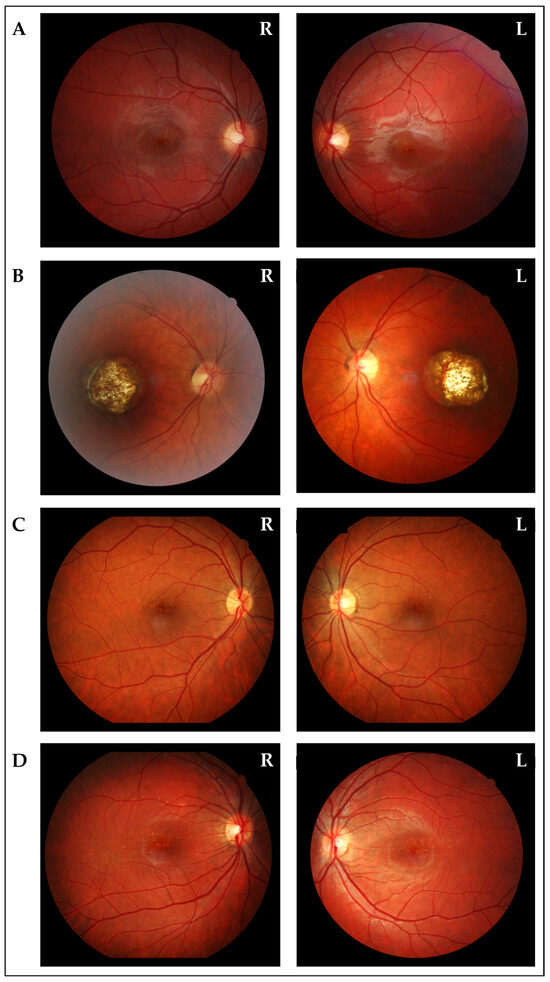 Inherited retinal dystrophies are rare conditions characterized by a wide genetic heterogeneity, as, to date, more than 300 genes have been associated with these disorders, following all patterns of inheritance (primarily autosomal recessive, but also autosomal dominant, X-linked both dominant and recessive, and mitochondrial) [1,2]. From a clinical perspective, they comprise extensively diverse entities, such as rod-cone dystrophies, cone-rod dystrophies, chorioretinal degenerations, and macular dystrophies. The latter is a group of degenerative conditions that primarily affect the macula, with progressive macular atrophy that causes significant loss of the central vision [3]. Furthermore, psychophysical, electrophysiological, and histopathological changes can be highlighted also in the mid-peripheral and peripheral retina, thus confirming the presence of a widespread retinal involvement [4]. Additionally, these conditions are characterized by a broad inter- and intrafamilial clinical variability, which can further hamper the achievement of a genetic diagnosis, as it may foster the hypothesis of the presence of peculiar scenarios, such as dual molecular diagnoses. Indeed, the presence of two distinct genetic disorders segregating within the same individual or the same family is an increasingly recognized event that challenges the accuracy of genetic testing [5].