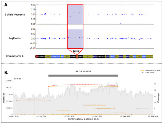 The duplication was confirmed through SNP-array analysis and nanopore sequencing, which allowed us to better define the size (98.39 Kb) and the breakpoints of the genomic rearrangement (NC_000006.12:g.99536433_99634823dup) (Figure 4A and 4B). Segregation analysis was performed on the proband’s healthy brother (III:1), resulting absent, and her affected brother (III:2), where its presence was confirmed. It was also possible to extend the analysis to one of the affected sisters (II:7) of the mother’s proband and her two children (III:4, III:5): the woman and her daughter resulted positive, while the son resulted negative, as expected.