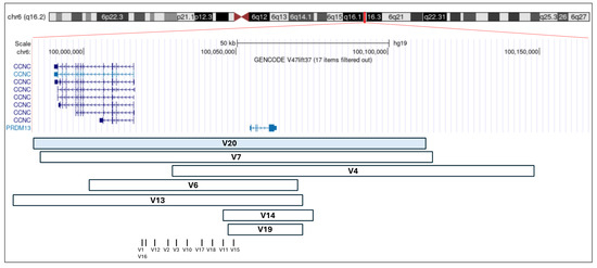 Schematic representation of reported duplications involving PRDM13 and CCNC, and SNVs. Each square represents a previously reported duplication, and each vertical bar corresponds to a previously reported SNV (see Table 1). The V20 duplication, identified in the family described in this study, is highlighted in light blue. The genomic coordinates refer to the GRCh37/hg19 assembly and were visualized using the UCSC Genome Browser.