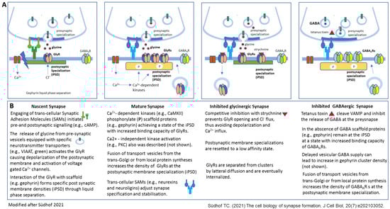 Different stages of inhibitory synapse formation and effects of experimental activity blockade with focus on the postsynaptic membrane specializations (modified after [8]). Synapses initiate as nascent contacts that mature into plastic synaptic connections. (A) Schematic view of a nascent glycinergic synapse (first), a mature glycinergic synapse (second), a glycinergic synapse (third), and GABAergic synapse after experimental activity blockade (fourth). In nascent synapses Synaptic Adhesion Molecules (SAMs) mediate initial transneuronal interactions. For example, latrophilins, specifically latrophilin-1 at inhibitory synapses, are thought to initiate intracellular signaling cascades that organize inhibitory synaptic specializations. Binding of the postsynaptic neuroligins (specifically NLG2 at inhibitory synapses) to its presynaptic partners, neurexins, is proposed to shape subsequent synapse maturation and properties (second). Inhibition of synapses with the high-affinity competitive antagonist strychnine results in altered GlyR clustering due to elimination of GlyRs from the postsynaptic membrane specialization (third). Inhibition of GABA release due to VAMP cleavage through tetanus toxin does not affect GABAAR clustering at the postsynaptic membrane specialization. (B) Short description of the events presented in A. Further details are provided in the manuscript text. NLG—neurologin 2, VAMP—vesicle-associated membrane protein.