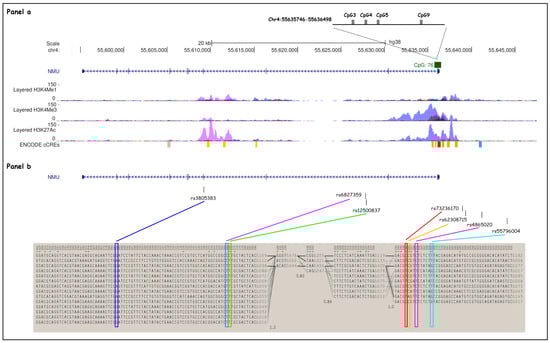 Selected NMU SNP and haplotype block structures. (Panel a) NMU (chr4: 55,595,231–55,636,298; GRCh38/hg38 assembly) spans chromosome region 4q12 and is composed of nine exons (depicted as blue lines throughout the gene). H3K4Me1, H3K4Me3, and H3K27Ac profiles are displayed as colored overlaid histograms (Bernstein Laboratory at the Broad Institute and the University of California, Santa Cruz, and part of the ENCODE database). Four CpG sites from the CpG island 76 (chr4: 55,635,746–55,636,498, GRCh38/hg38 assembly) found to be significantly associated with methylation patterns in Marotta et al. . are shown as gray boxes. (Panel b) Seven SNPs (depicted as black lines on the top) were selected for the haplotype study: rs73236170, rs62308715, rs4865020, and rs55796004, located upstream of the NMU TSS, and rs3805383, rs6827359, and rs12500837 within the gene body. Two main haplotype blocks (chr4: 55,595,229–55,653,833; GRCh38/hg38 assembly) have been identified in NMU, in the gene body (block on the left) and in the promoter region (block on the right), respectively.
